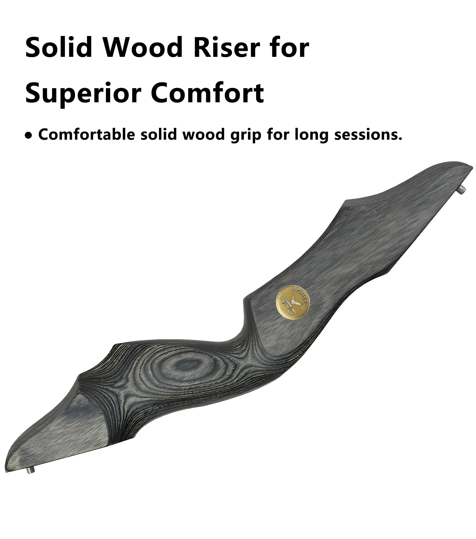 The heart of this bow is its striking solid wood riser, offering not just visual appeal but also an ergonomic grip that feels natural and secure in your hand. Power is generated by the robust laminated limbs, combining fiberglass with a bamboo core for a smooth draw, quick energy release, and reduced vibration.