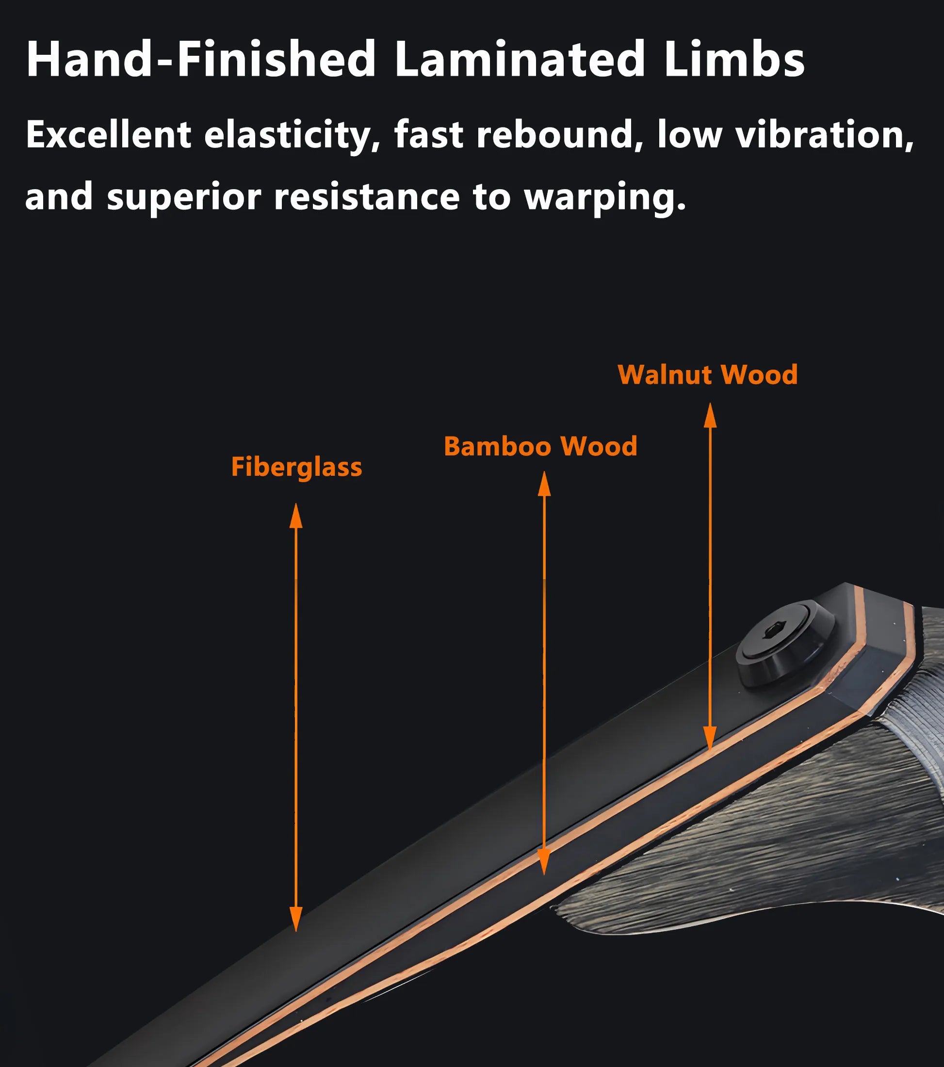 High-Performance Laminated Limbs: Built with a fiberglass and bamboo core, these hand-finished limbs offer excellent elasticity, fast arrow speed (high initial velocity), minimal hand shock, and superior durability for consistent power.
