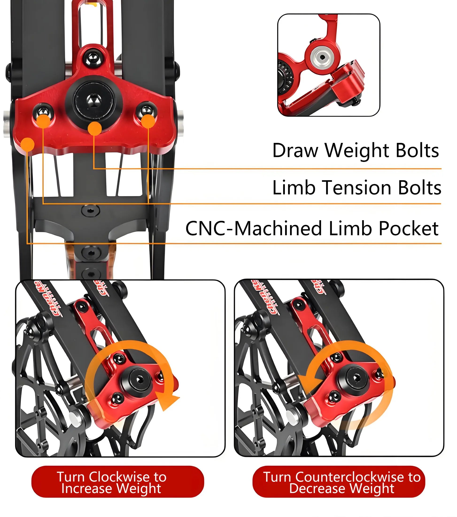 Draw weight adjustments via visible weight bolts (turn clockwise to increase, counterclockwise to decrease).