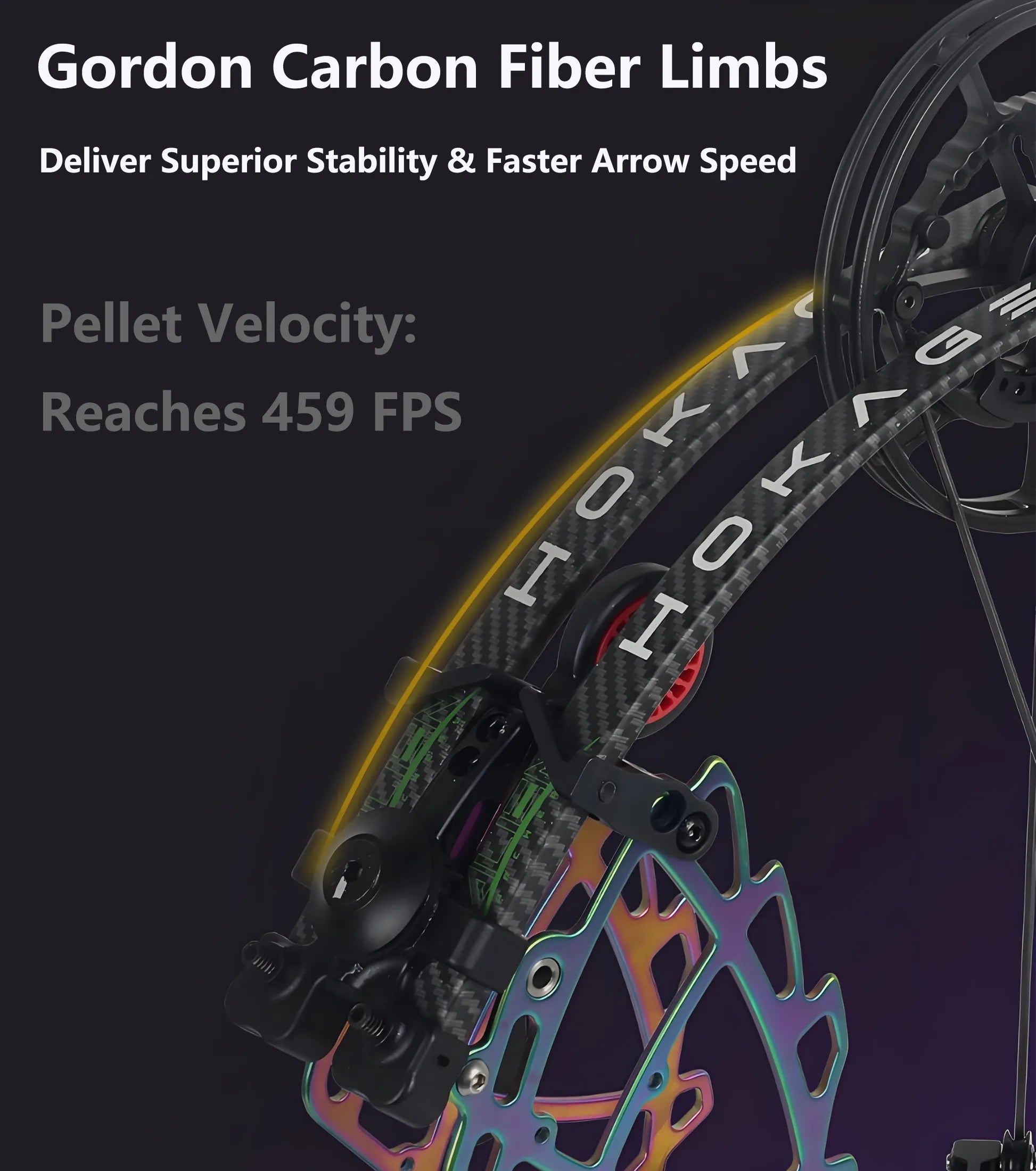 Exceptional Power & Speed: Adjustable draw weight from 40 to 70 lbs. Experience an 80% let-off for steady aiming and a blistering arrow speed of 335 FPS. The pellet speed reaches a phenomenal 459 FPS.
