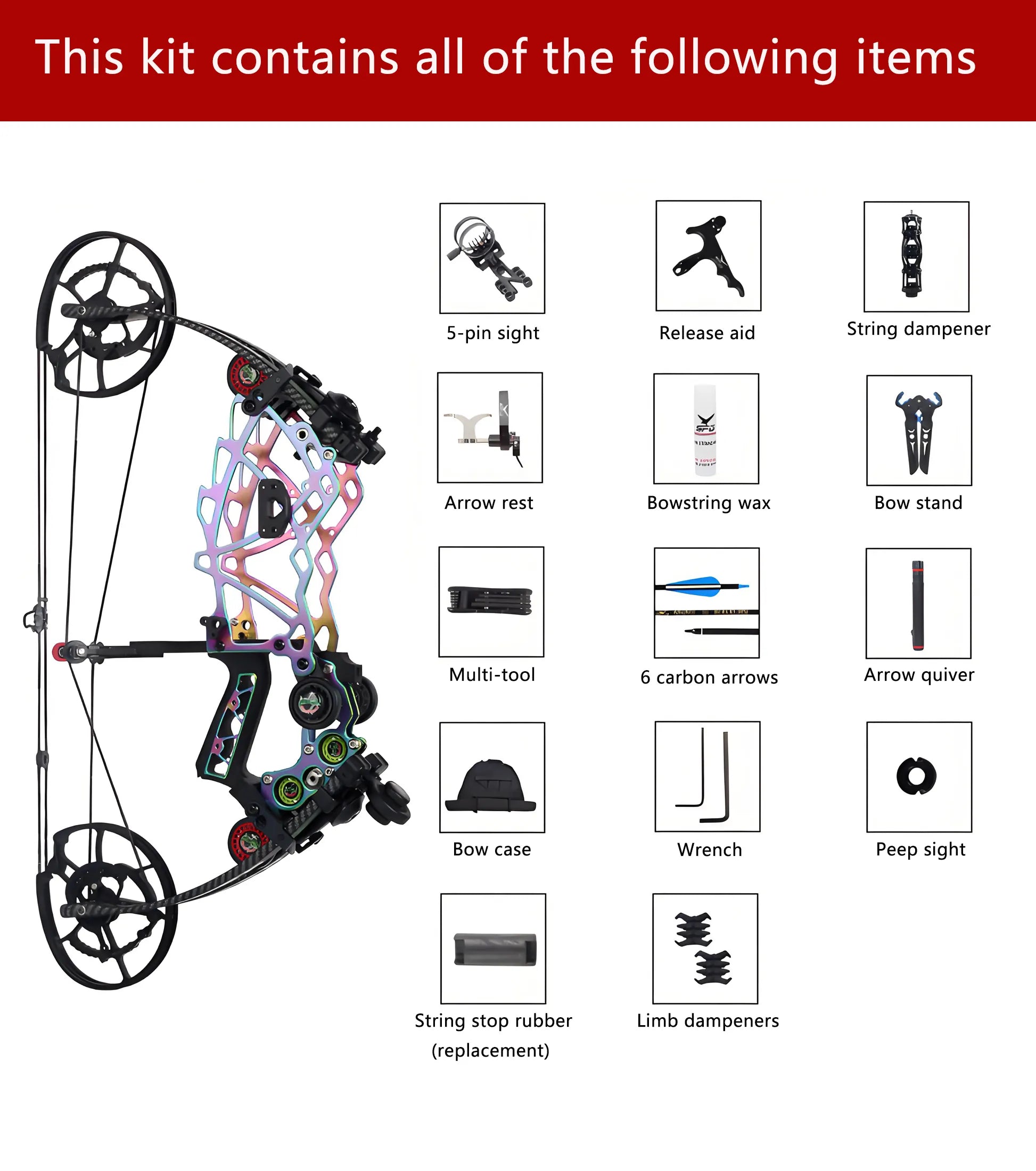 Material: Titanium Alloy Riser, Carbon Fiber Limbs, CNC Aluminum Cams