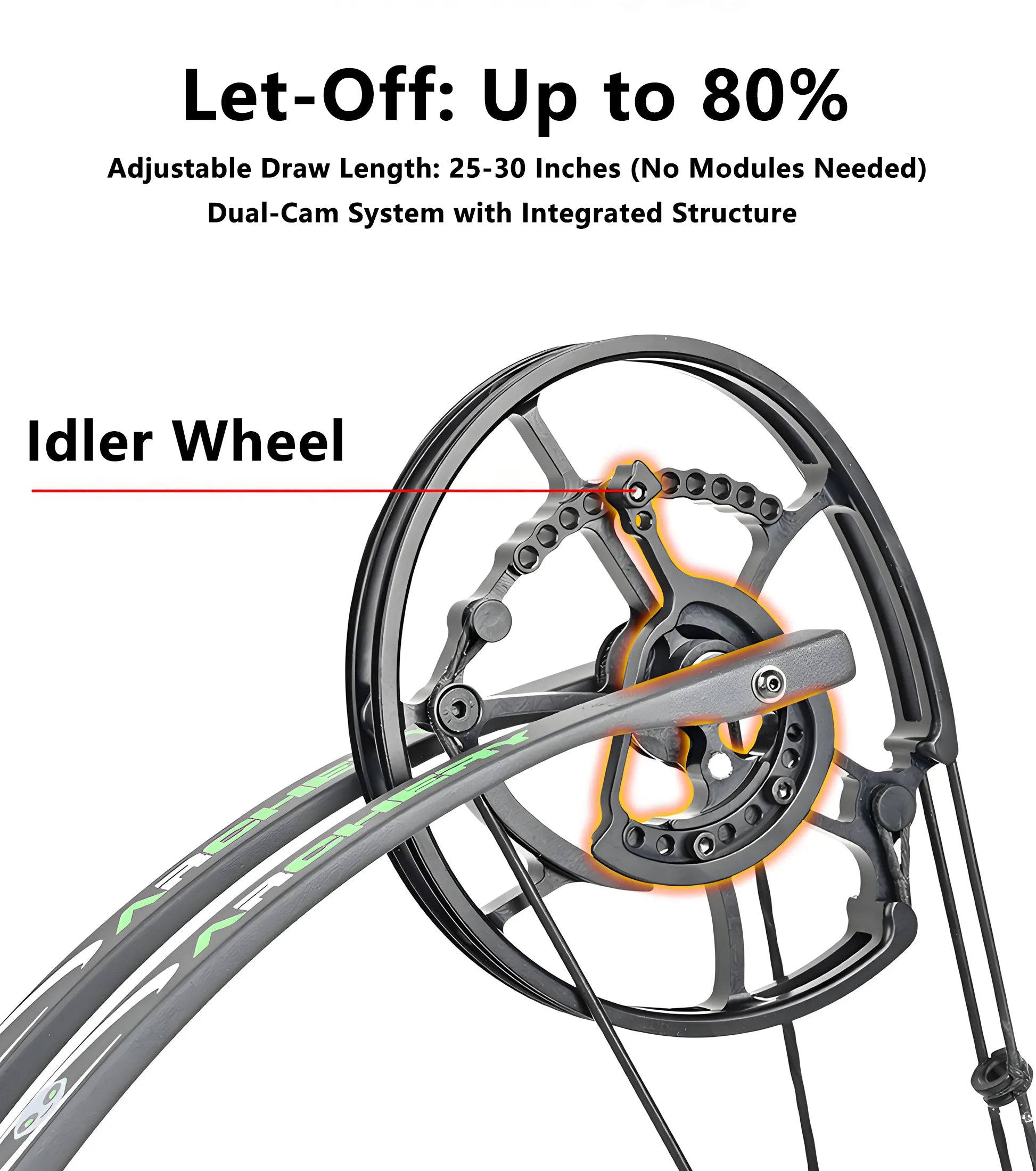 Superior Speed & Power: Experience blazing speeds of up to 340 FPS with arrows and an impressive 380 FPS with steel projectiles. The high-efficiency dual-cam system and 80% let-off reduce holding weight at full draw, allowing for steadier aiming and smoother releases.