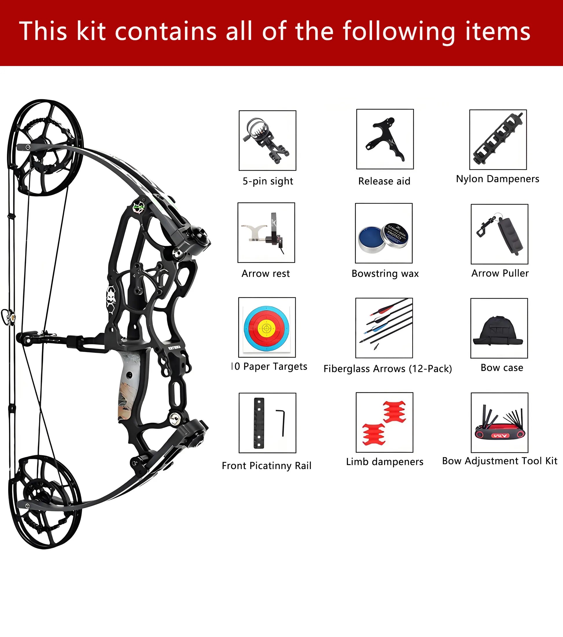 Adjustable Draw Weight & Length: Easily tune your bow from 45 to 75 lbs of draw weight with the integrated poundage adjustment bolts. The draw length is continuously adjustable from 25 to 30 inches with no modules needed, making it perfect for archers of all sizes.