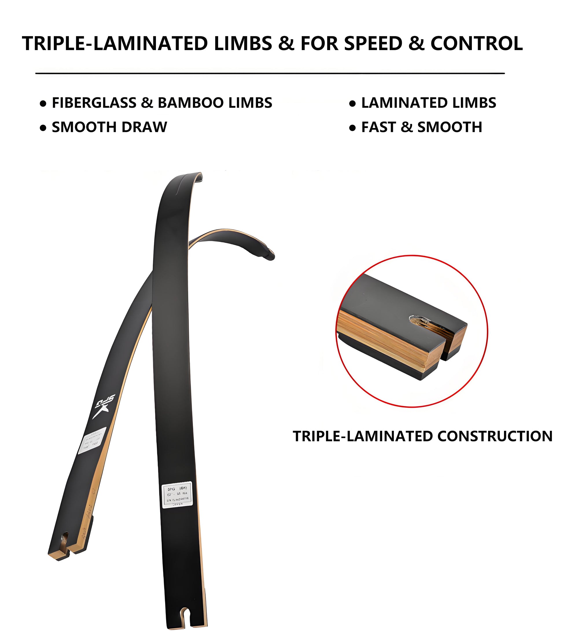 High-Speed Laminated Limbs: Our limbs are the heart of the bow's performance. They are constructed using a powerful tri-layer lamination of black fiberglass, natural bamboo, and phenolic resin. This combination provides a surprisingly smooth draw, reduced vibration, and fast arrow velocity for a flatter trajectory.